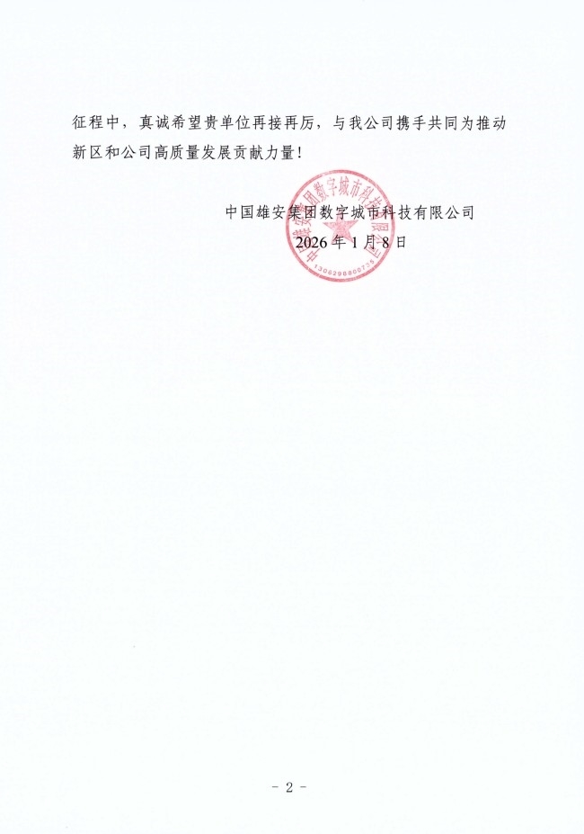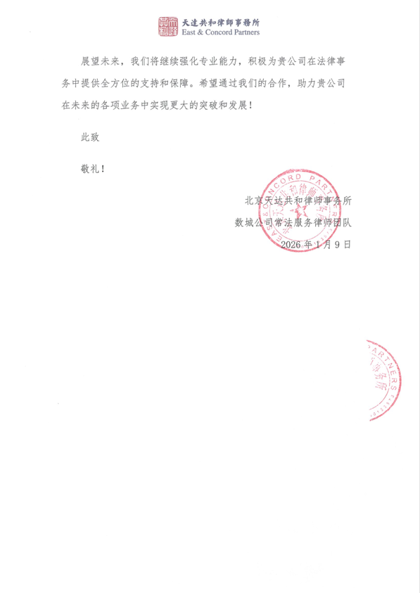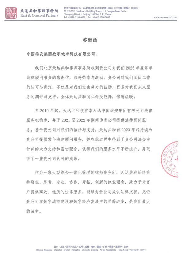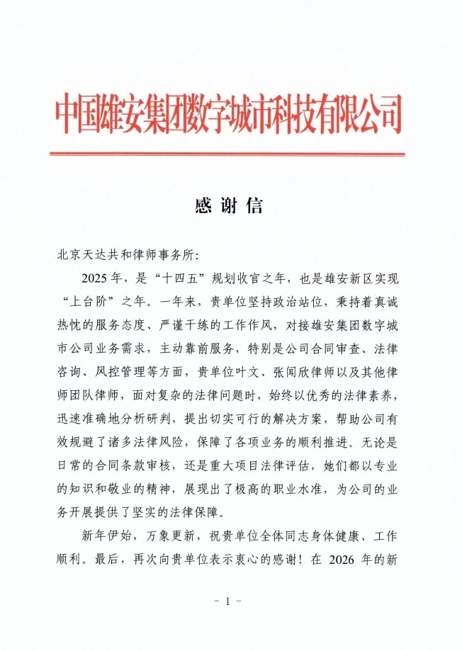 2026年1月8日,中国雄安集团数字城市科技有限公司向天达共和律师事务所发来感谢信,对天达共和在2025年度提供的常年法律服务给予高度赞誉。这封感谢信不仅是对法律服务质量的专业认可,更是对天达共和深度参与国家战略建设的价值肯定。
